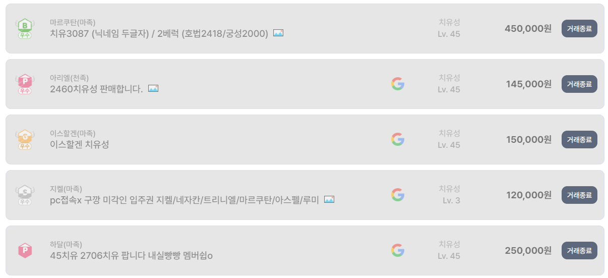 먼저 가장 거래량이 많았던 구간은 전투력 2500~3000대 치유성 계정이다. 이 구간은 12만 원에서 35만 원 선에서 거래가 종료된 사례가 다수 확인된다. 아툴 수치가 낮거나 돌파 수치가 없는 기본형 계정, 혹은 구글 깡통 형태의 계정들이 여기에 해당한다. 신규 유입 유저나 복귀 유저가 빠르게 콘텐츠를 즐기기 위해 선택하는 대표적인 구간이라고 볼 수 있다.
