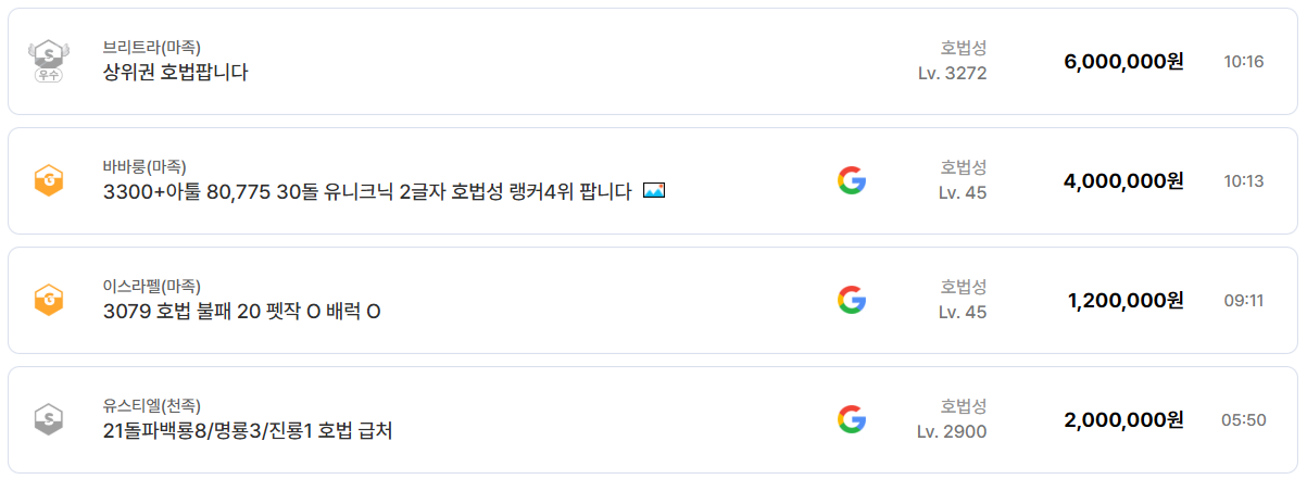 최상위권은 확실히 다른 영역이다. 투력 3300 이상, 랭커급 호법성은 400만 원 이상부터 시작하며, 옵션 구성에 따라 700만 원대까지도 형성된다. 예를 들어 공격력 7000 이상, 불패 20·질풍 20 풀세팅, 희귀 닉네임 보유 계정은 단순 스펙 이상의 프리미엄이 붙는다. 이런 계정들은 일반 유저보다는 바로 상위 콘텐츠를 즐기려는 구매층을 타겟으로 하며, 가격 협상 여지가 적은 편이다.