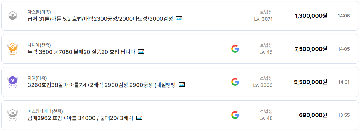 눈여겨볼 점은 급처 매물의 존재다. 동일 스펙 대비 20~30% 낮은 가격으로 등록되는 계정들이 간간이 등장하며, 이런 매물은 대부분 등록 당일 또는 몇 시간 내 거래가 완료된다. 특히 2800~3000 구간에서 급처 계정을 잘 잡으면 가성비 측면에서 매우 좋은 선택이 된다. 반대로 상위 스펙 계정은 가격 조정이 거의 없고, 구매까지 시간이 다소 걸리는 경우도 있다.