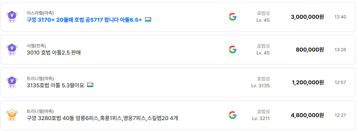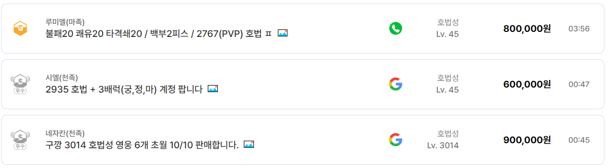반면 3000 중후반~3200 이상부터는 가격 상승 폭이 급격해진다. 불패 20 기준에 질풍 20, 강타 옵션이 잘 붙어 있고, 암룡·흑룡·영웅 장비 세팅이 갖춰진 계정은 200만 원 이상에서 거래된다. 특히 구깡 계정이나 내실이 깔끔한 경우, 구매자 선호도가 높아 등록 후 빠르게 거래가 이루어지는 편이다. 아이템매니아 기준으로 3130~3200대 호법성 계정은 평균 200만~300만 원 선에서 실제 거래 사례가 다수 확인된다.