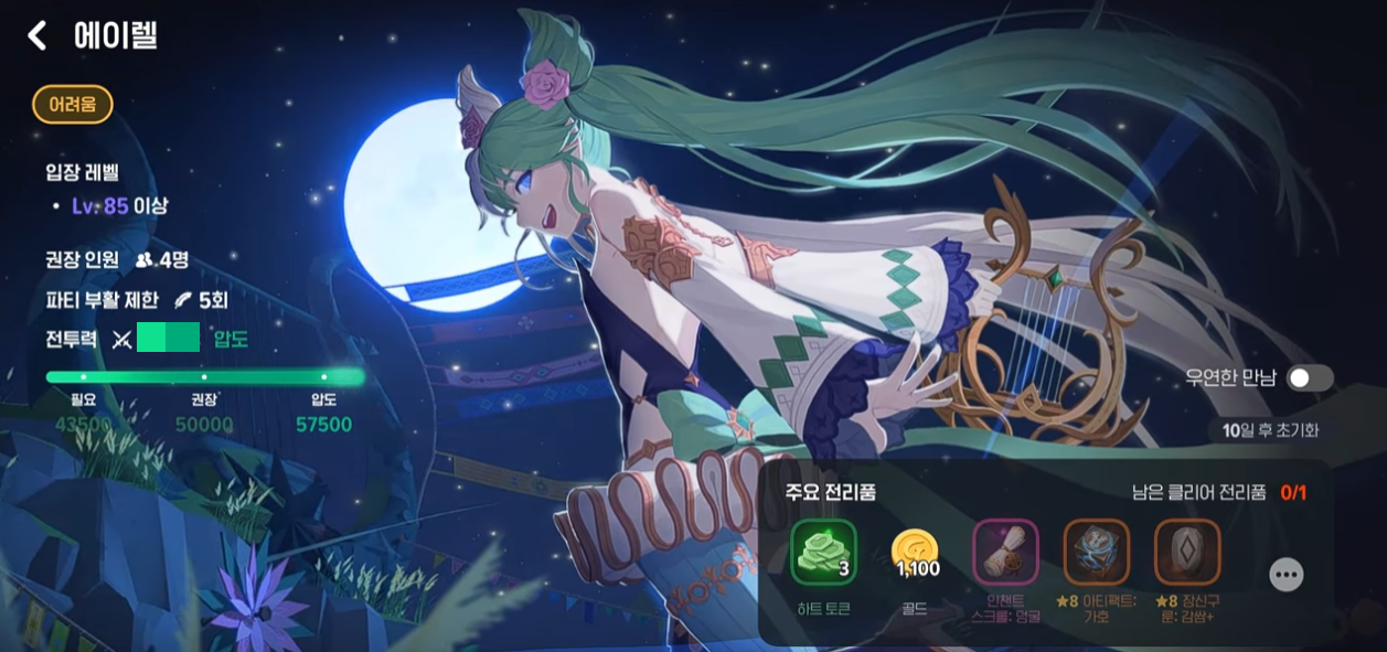 실제 플레이 기준으로 보면 5만 초반대 전투력만 되어도 충분히 클리어가 가능합니다. 다만 파티원 전원이 패턴을 어느 정도 숙지하고 있어야 안정적인 진행이 가능합니다. 광폭화 패턴이 없어 죽지만 않으면 결국 클리어는 가능하다는 점이 장점입니다.