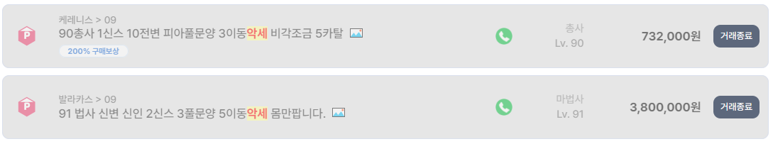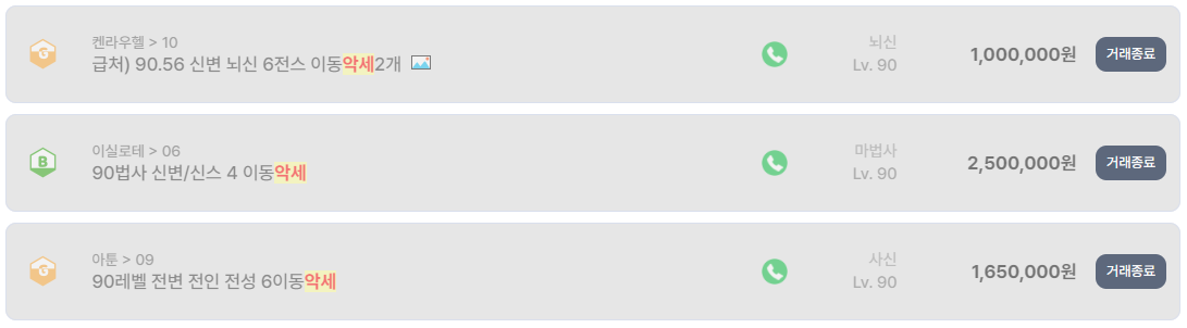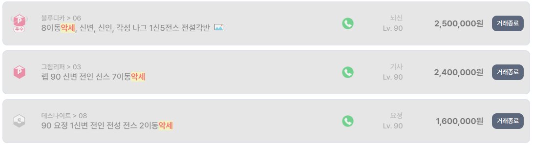 또한 급처 문구가 포함된 거래 사례도 눈에 띈다. 켄라우헬 서버의 90레벨 뇌신 캐릭터는 신변과 6전스 구성임에도 100만 원에 거래 종료되었다. 동일 스펙 대비 상대적으로 낮은 가격으로, 빠른 현금화를 원하는 판매자의 의도가 명확히 드러난 사례다.
