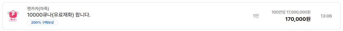 젠카카 서버(마족): 10,000큐나(유료재화) 단위의 거래가 반복적으로 포착되고 있습니다. 현재 170,000원 선에서 거래가 이루어지고 있는데, 이는 100만 단위로 환산 시 약 1,700만 원에 달하는 거대 규모의 매물이 활발히 소화되고 있음을 뜻합니다. 특히 200% 구매보상이 적용된 매물들이 빠르게 소진되는 점은 고액 거래에 대한 유저들의 안전 중심 성향을 잘 보여줍니다.