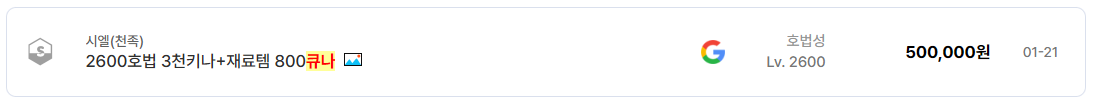 시엘 서버(천족): 레벨 2600대의 호법성 캐릭터가 3,000키나와 각종 재료 아이템, 그리고 800큐나를 포함해 500,000원에 거래된 사례가 있습니다. 이는 신규 유저가 기반을 닦기 위해 재화가 포함된 계정을 통째로 인수하는 방식이 여전히 선호되고 있음을 증명합니다.