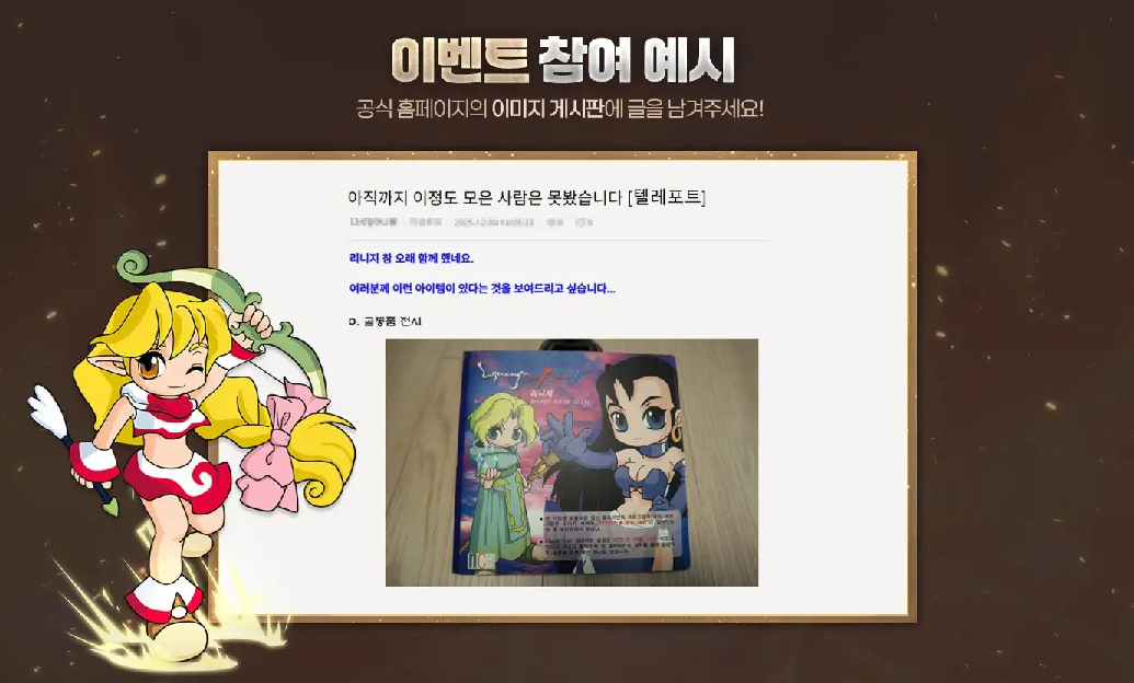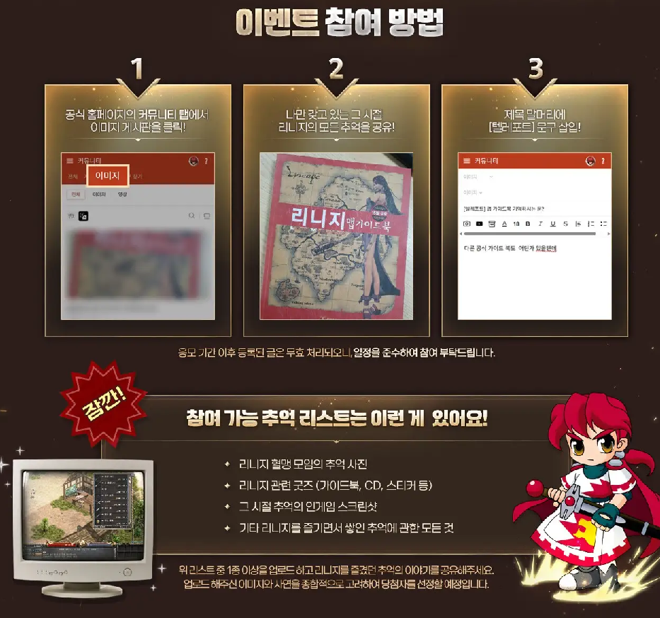이번 가이드북 이벤트는 크게 두 가지 방식으로 진행된다. 먼저 공식 홈페이지를 통한 참여 방법이다. 리니지 클래식 공식 홈페이지 커뮤니티 메뉴에서 이미지 게시판으로 이동한 뒤, 자신이 보관하고 있던 리니지 관련 사진이나 추억이 담긴 자료를 업로드하면 된다. 과거 혈맹 오프라인 모임 사진, 오래된 가이드북, CD 패키지, 인게임 스크린샷 등 리니지와 관련된 자료라면 대부분 참여가 가능하다.