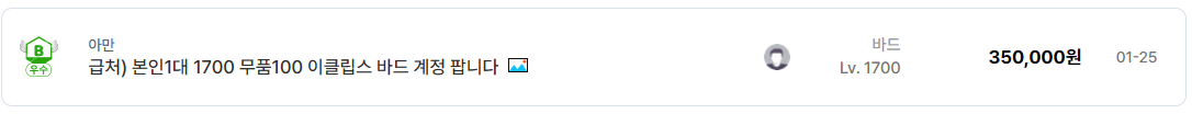 1700대 바드 계정이 35만~45만 원 선을 유지하는 반면, 같은 레벨의 비주류 딜러는 10만 원대에 머무는 경우도 많다.