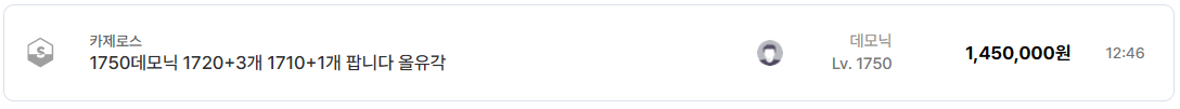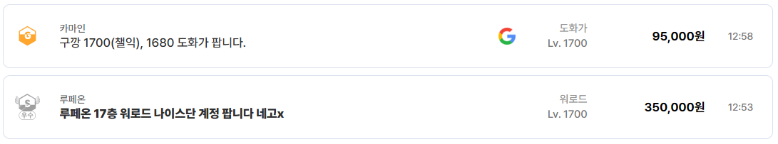 1700 도화가 계정이 9만5천 원, 1700 워로드가 35만 원, 1710 이상부터는 30만~100만 원대가 기본값처럼 형성된다. 이는 1700레벨이 현재 레이드 참여, 파티 경쟁, 콘텐츠 접근성의 최소 기준선으로 인식되고 있다는 뜻이다.
