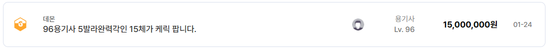 96레벨 구간은 리니지 계정거래에서 가장 매물이 많은 구간이다. 96레벨 용기사, 기사, 창기사 계정들이 6,000,000원~15,000,000원 사이에 다수 포진해 있으며, 장비 구성에 따라 가격이 명확히 갈린다. 예를 들어 5발라 완력 각인, 15체력 가호를 갖춘 용기사는 15,000,000원에 거래중인 반면, 기본 장비 위주의 96레벨 계정은 3,500,000원~5,000,000원대에서 형성되어 있다. 같은 레벨이라도 ‘올7악세’, ‘각인 여부’가 가격을 좌우하는 핵심 요소로 작용하고 있다.