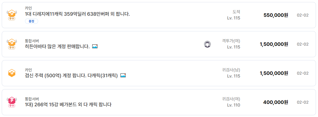 다캐릭 운영 계정 역시 던전앤파이터 거래의 핵심이다. 20캐릭 이상 만렙 계정, 월 수익 구조가 안정적으로 갖춰진 계정, 레이드 참여가 가능한 캐릭터가 다수 포함된 계정은 가격 대비 효율을 중시하는 유저층에게 매력적인 선택지다. 특히 디레지에, 카인 서버 중심으로 이러한 계정들이 활발하게 등록되고 있다.