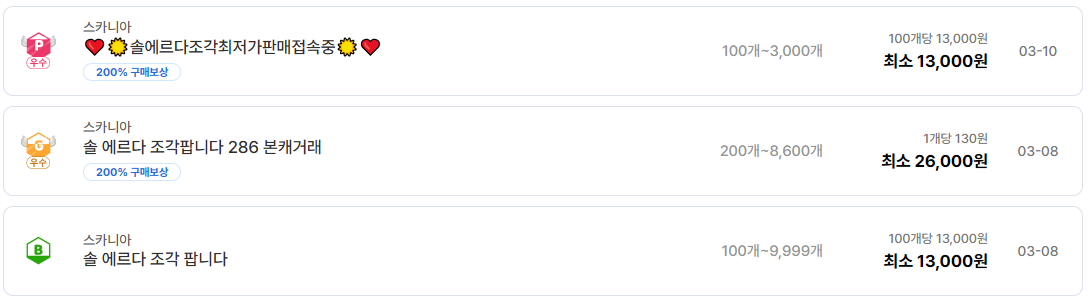 마지막으로 스카니아 서버에서는 100개부터 9,999개까지 판매하는 매물이 등록되어 있으며 역시 100개당 13,000원 가격으로 형성되어 있습니다.