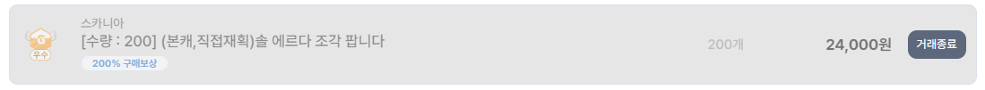 스카니아 서버 거래도 꾸준히 이루어지고 있습니다. 최근 거래 기록을 보면 200개의 솔 에르다 조각이 24,000원에 거래된 사례가 있습니다. 이를 계산하면 역시 개당 약 120원 가격입니다. 스카니아 서버는 유저 수가 많은 서버이기 때문에 거래량도 비교적 높은 편입니다.
