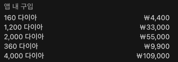 | 4,000 다이아 | 109,000원 | 27.25원 |
