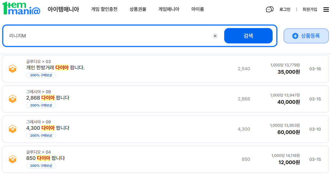 리니지M 다이아 거래를 고려하고 있다면 다양한 매물을 확인할 수 있는 아이템매니아를 참고하면 현재 거래 흐름을 파악하는 데 도움이 됩니다.