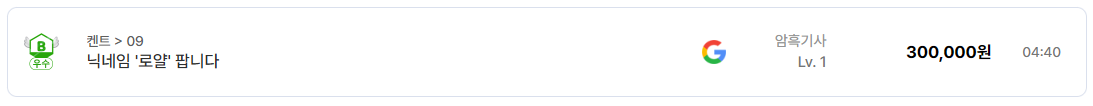 다음으로 확인된 거래는 닉네임 '로얄'이다. 켄트 09 서버 암흑기사 캐릭터로 등록되어 있으며 가격은 30만원이다. 위에서 언급한 외자 닉네임이나 강력한 이미지 단어와 비교하면 가격 차이가 크지만 그래도 일반적인 닉네임보다는 충분히 높은 수준의 가격이다.