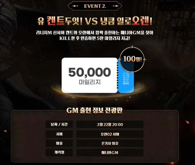 진행 내용: 특정 시간에 매니아 GM이 리니지M 신규 서버에 직접 접속합니다. 유저들은 게임 내에서 돌아다니는 GM을 찾아내어 처치(킬)해야 합니다.