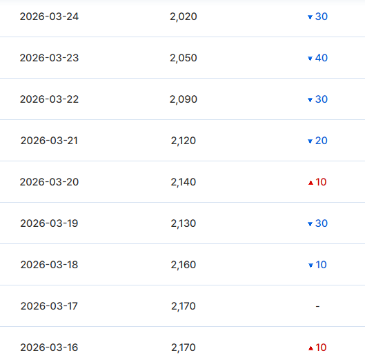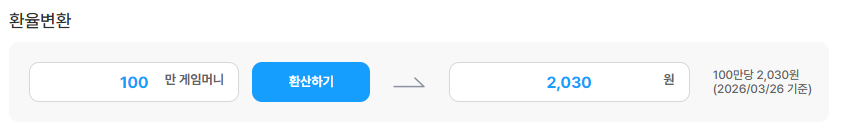 3월 12일 기준 100만 메소당 2,160원이었던 가격은 현재 3월 26일 기준 2,030원까지 내려왔습니다. 약 130원 하락으로 수치만 보면 큰 변동이 아닌 것처럼 보일 수 있지만, 거래 흐름을 보면 꾸준한 하락 압력이 이어지고 있는 상태입니다.