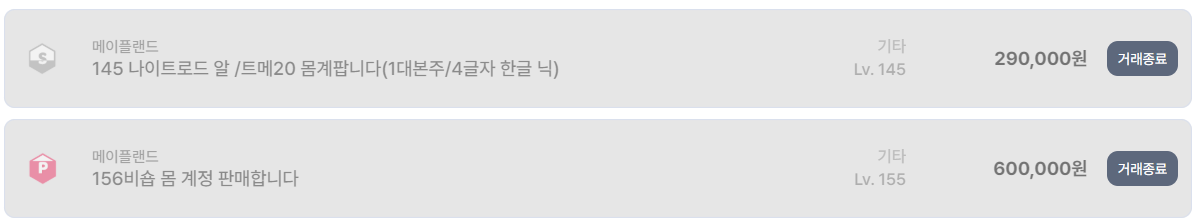 비숍, 나로, 헌터, 메업 캐릭터가 함께 구성된 계정들은 레벨 대비 효율이 뛰어나 40만~50만 원대에서도 빠르게 거래 종료되는 모습을 보였다.