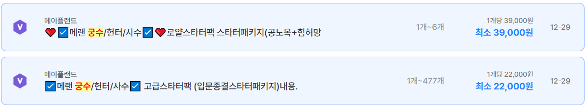 우선 궁수 스타터 패키지 거래부터 살펴보면, 로얄 스타터팩과 고급 스타터팩의 가격 차이가 꽤 큰 편이다. 로얄 스타터팩은 개당 약 39,000원 수준으로 형성돼 있으며, 공노목과 기본 스펙 장비를 포함한 빠른 진입용 상품으로 인식된다. 반면 고급 스타터팩은 개당 22,000원 선까지 내려와 있는데, 이는 대량 공급이 가능하고 입문자 유입이 늘어난 영향으로 해석된다. 스타터팩 시장은 전반적으로 공급이 안정화된 상태다.