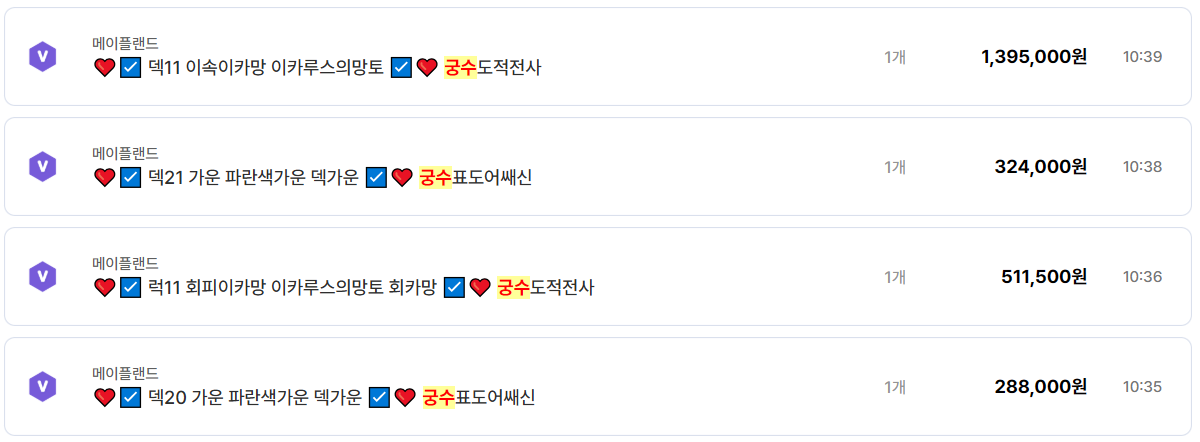 메이플랜드 메랜 궁수 계정 거래 및 장비 시세 분석 노목 이카망 가운 정리