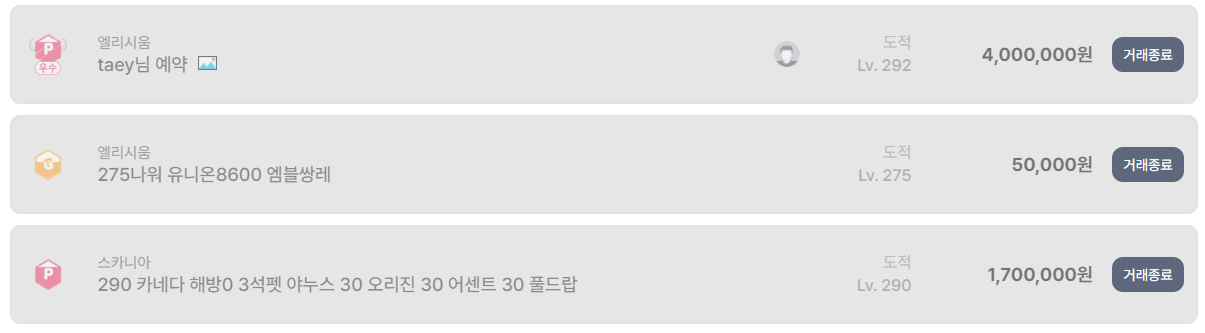 반면 Lv.285 이상, 특히 290 이상 구간으로 올라가면 가격대는 완전히 달라진다. 엘리시움 서버의 Lv.292 도적 계정은 400만 원, 스카니아 서버의 Lv.290 계정은 170만 원에 거래 종료되었다. 같은 290대라도 자석펫 보유 여부, 해방 진행 상황, 오리진 및 어센트 스킬 레벨에 따라 금액 차이가 크게 발생한다. 단순히 레벨만 높은 계정보다는 즉시 보스 플레이가 가능한 세팅이 훨씬 높은 평가를 받는다.